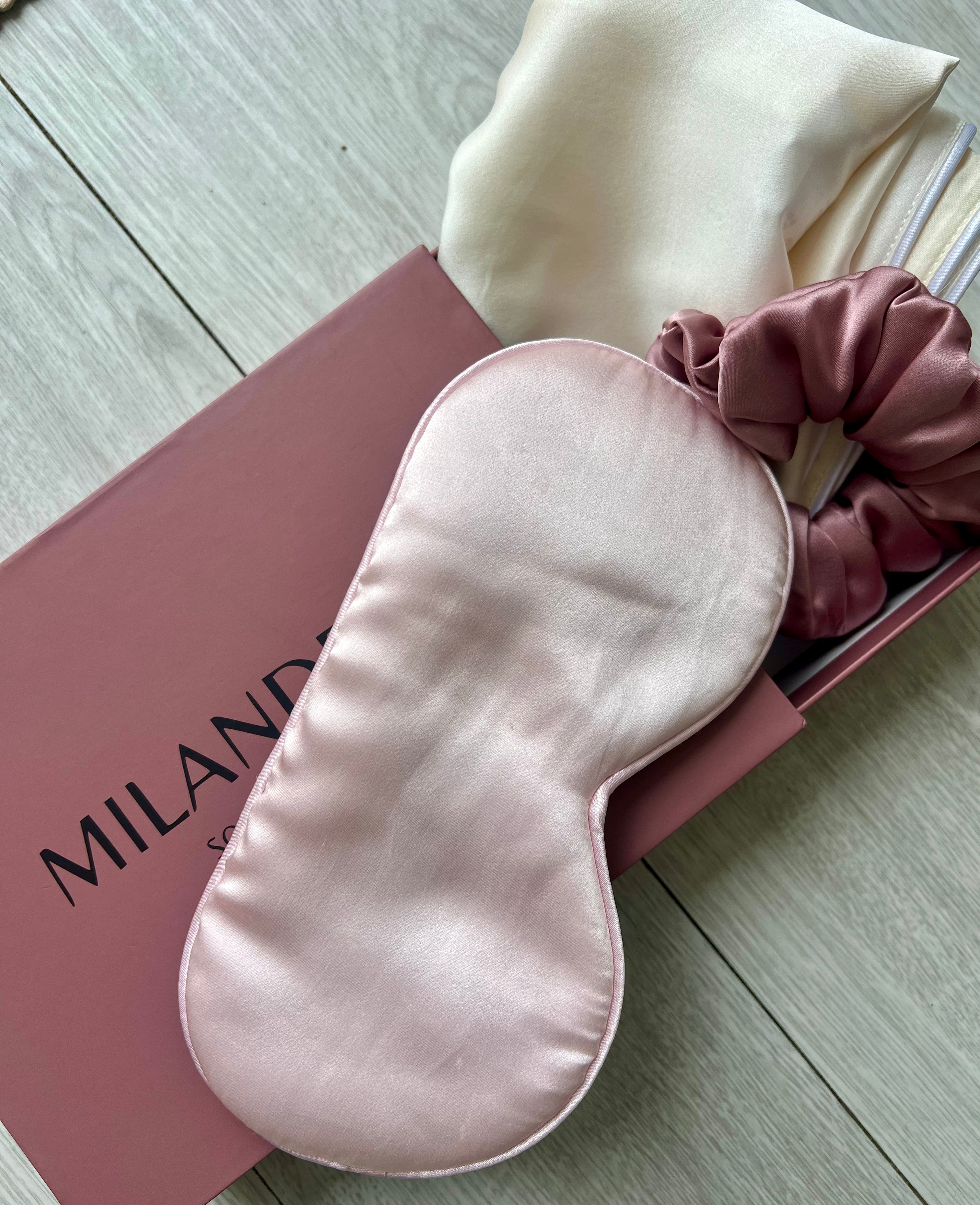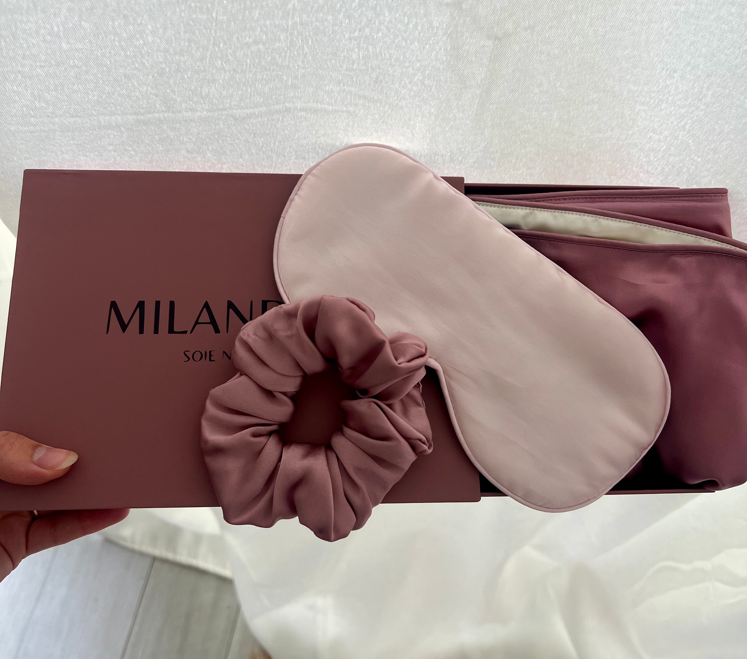 Le coffret sommeil Milandrea comprend une taie d'oreiller en soie de mûrier, un masque de nuit en soie et un chouchou assorti. Ces trois produits sont conçus pour améliorer votre confort nocturne et prendre soin de votre peau et de vos cheveux pendant votre sommeil.