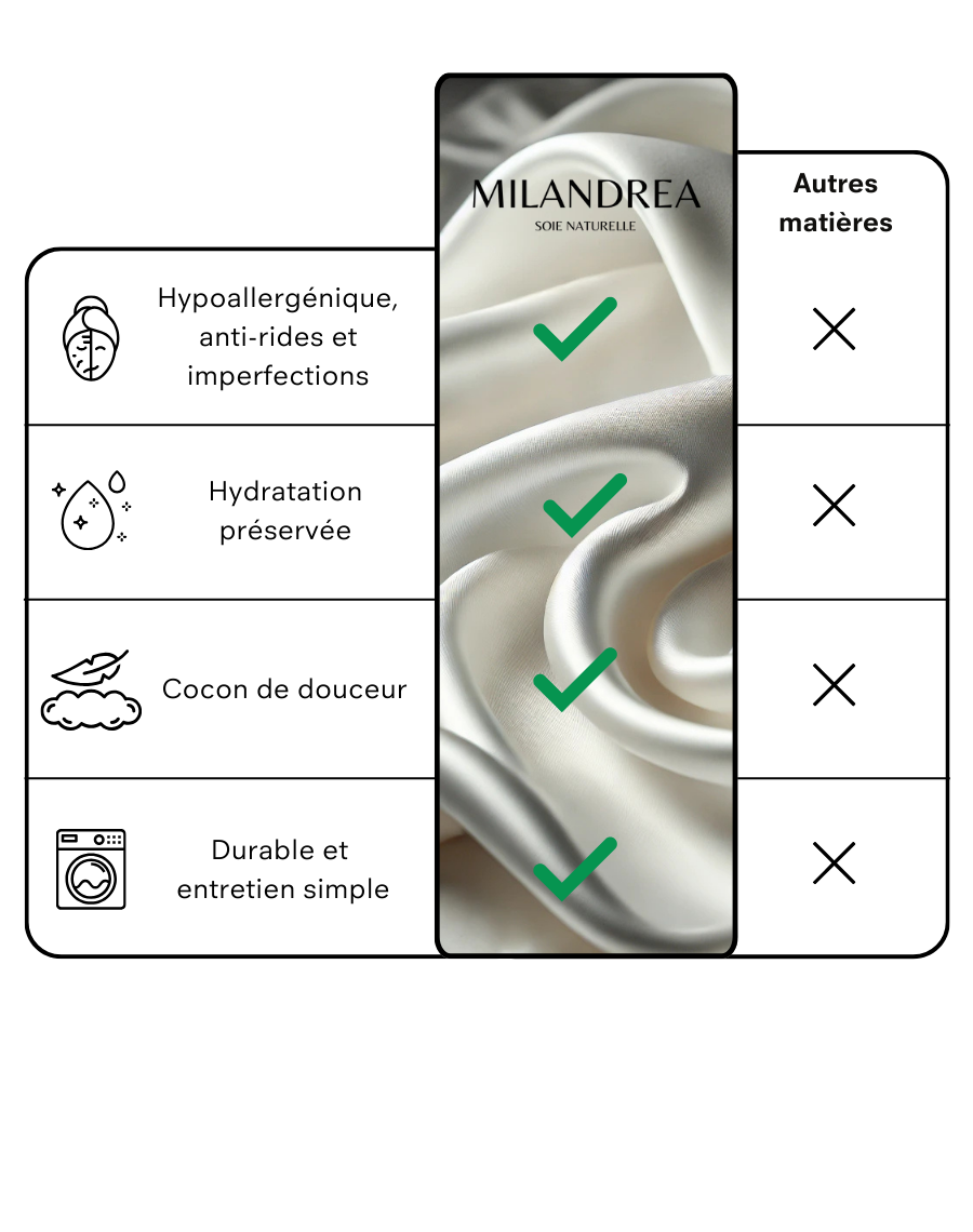 La soie est naturellement douce, hypoallergénique, enrichie naturellement de 18 acides aminés et n'absorbe pas vos soins de nuit, ce qui permet à votre peau de rester hydratée et protégée.
